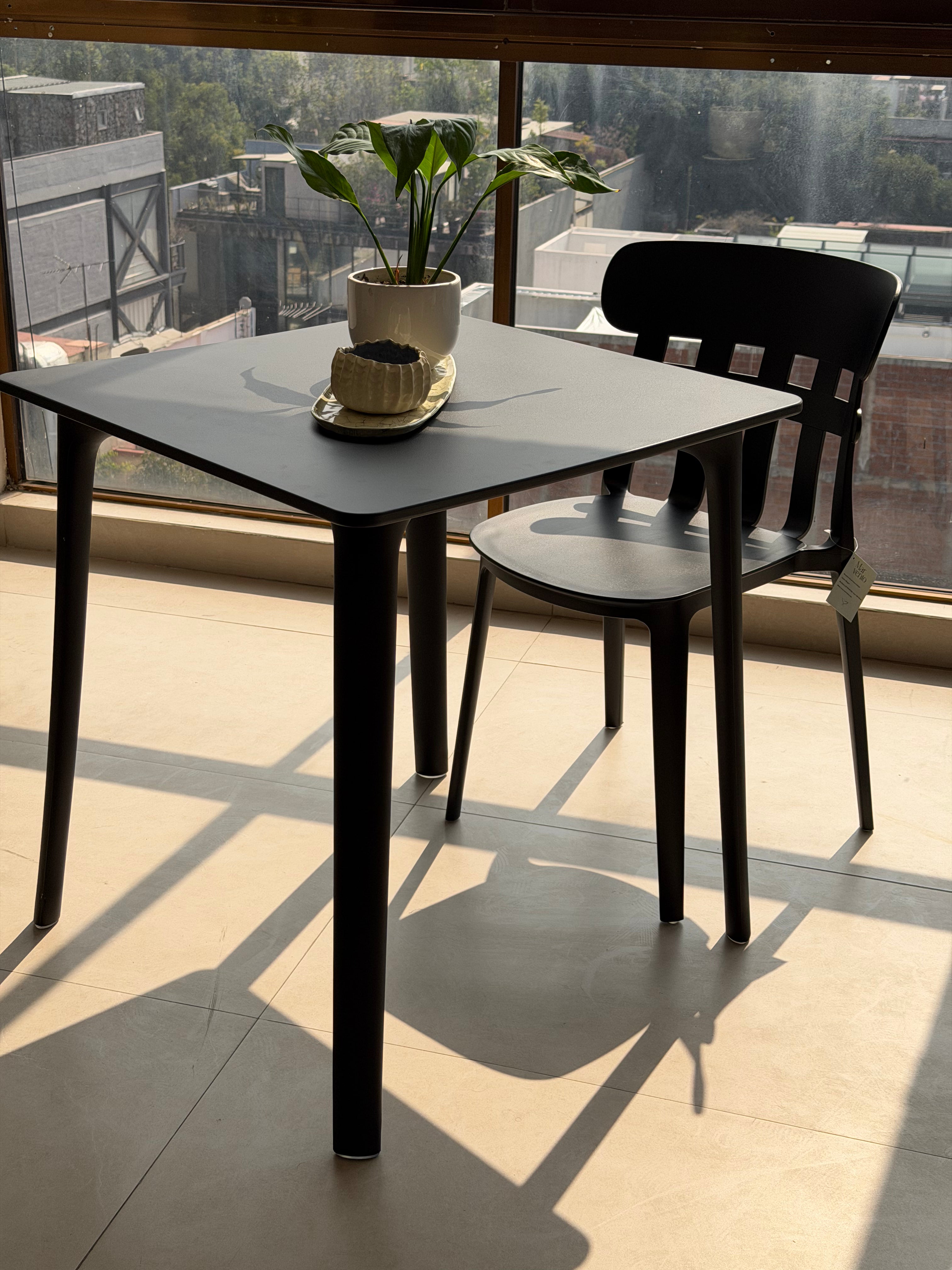 Mesa cuadrada de líneas sobrias y diseño funcional, pensada para uso diario en interior o exterior.