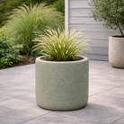 Maceta de formato cilíndrico con diseño limpio y acabado mate en tono verde.
