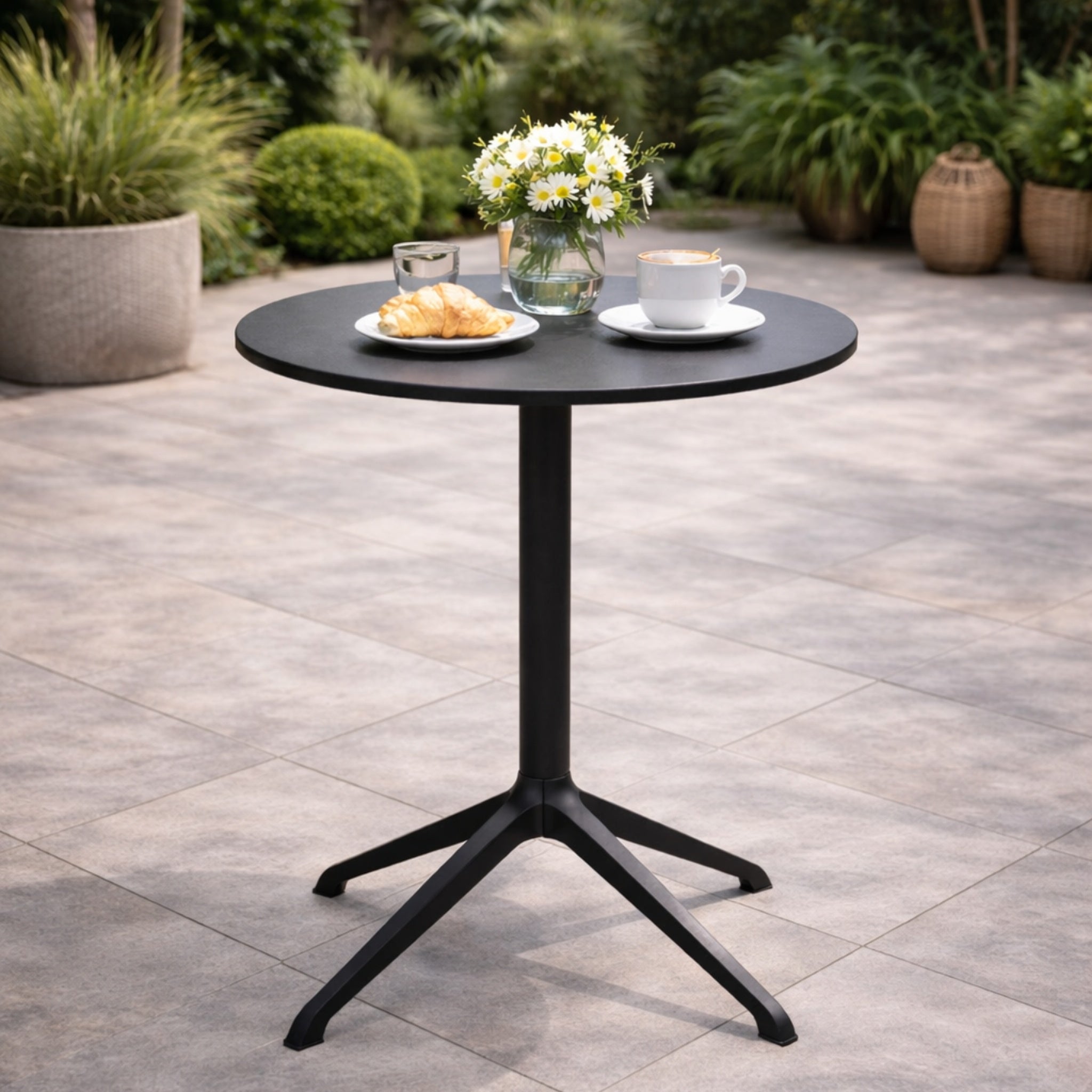 Mesa redonda Marea de 70 x 75, cubierta de fibra de vidrio y base de aluminio.