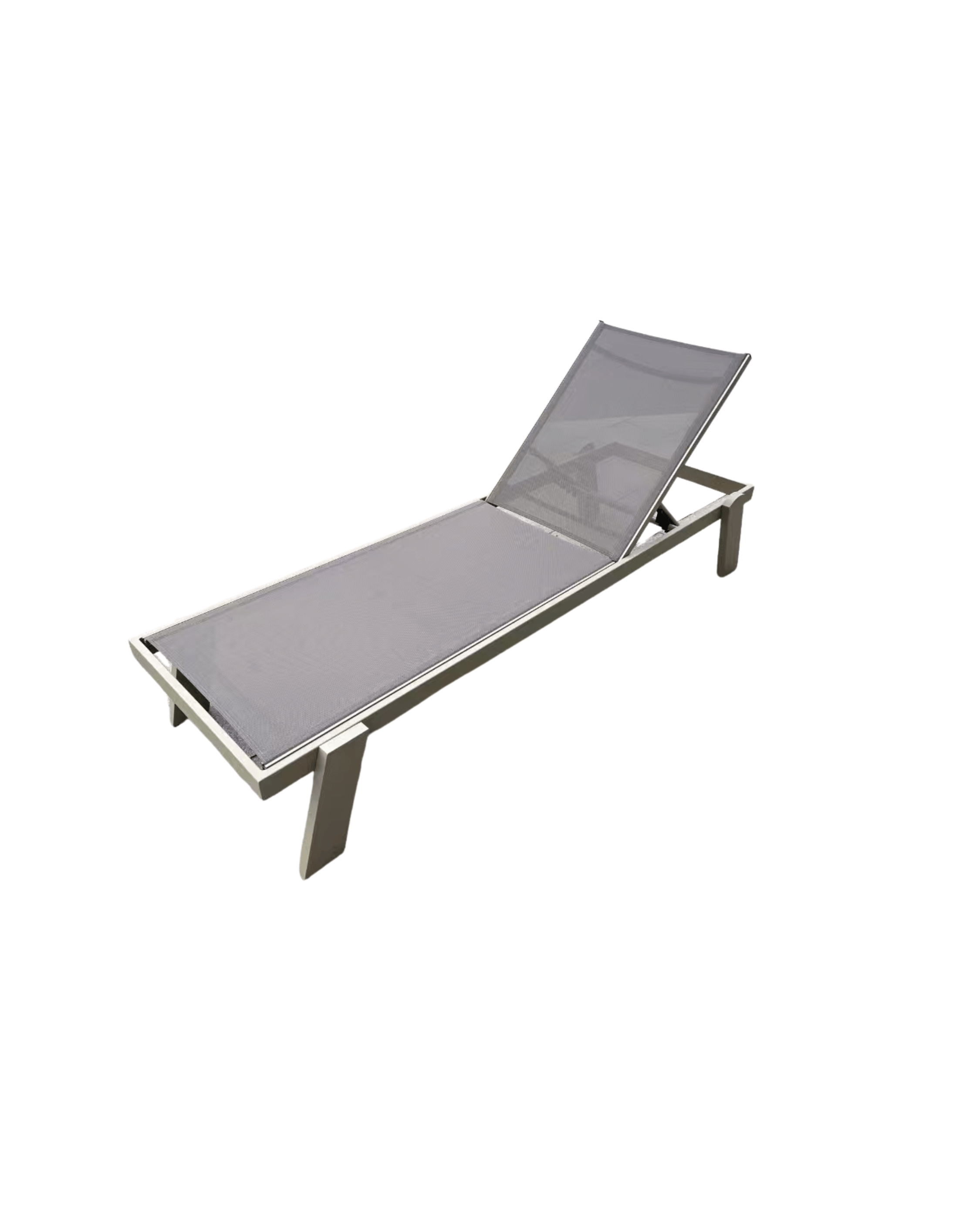 Camastro gris de gran tamaño. Robusto y elegante, pensado para descanso prolongado en resorts o jardines de lujo.