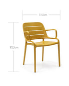 Silla de diseño italiano en color ginger. Fabricada en polipropileno con fibra de vidrio, resistente al sol, lluvia y apilable. Ideal para terrazas modernas.